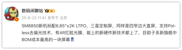 iQOO 15将采用金属中框搭配AG玻璃背板,后置相机模组延续“万里舷窗”设计。手机正面是一块6.85英寸三星2K LTPO直屏,采用Pol-less去偏光技术和AR抗眩光涂层,指纹识别为3D超声波方案。